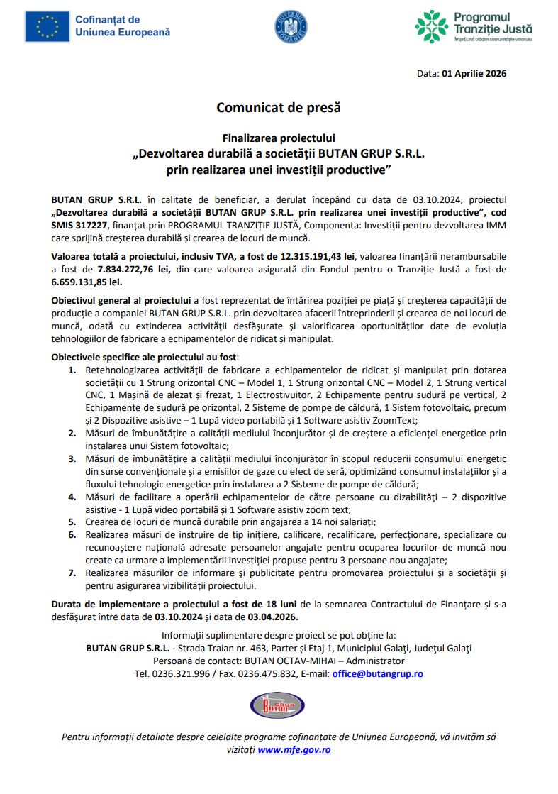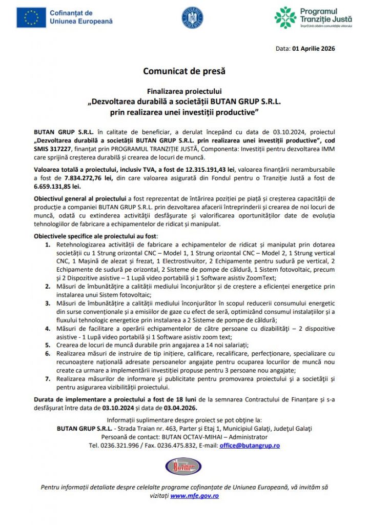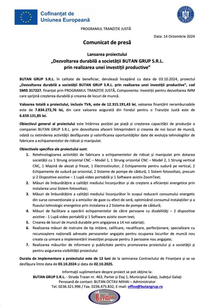 BUTAN GRUP S.R.L., în calitate de beneficiar, derulează începând cu data de 03.10.2024, proiectul „Dezvoltarea durabilă a societății BUTAN GRUP S.R.L. prin realizarea unei investiții productive”, cod SMIS 317227, finanțat prin PROGRAMUL TRANZIȚIE JUSTĂ (https://mfe.gov.ro/ptj/despre-program-programare/), Componenta: Investiții pentru dezvoltarea IMM care sprijină creșterea durabilă și crearea de locuri de muncă.